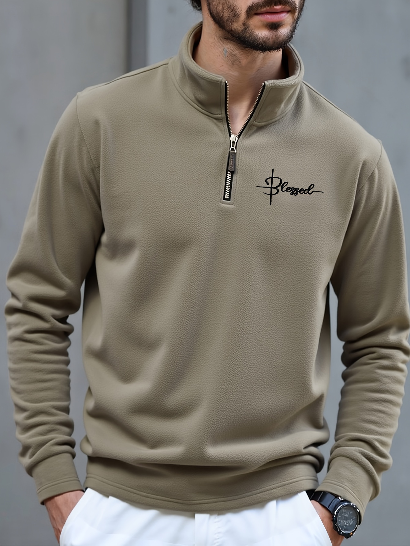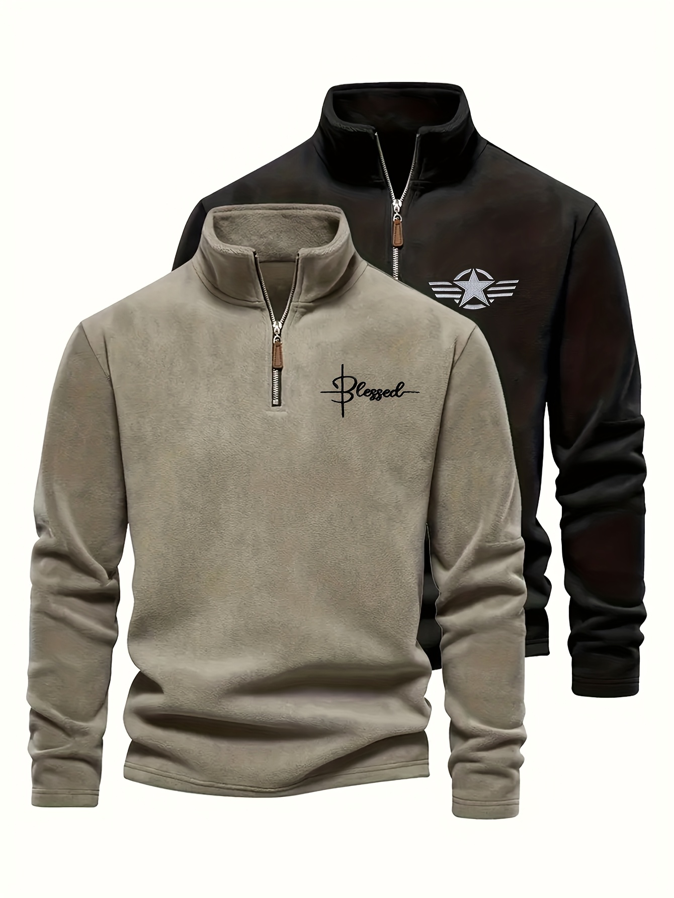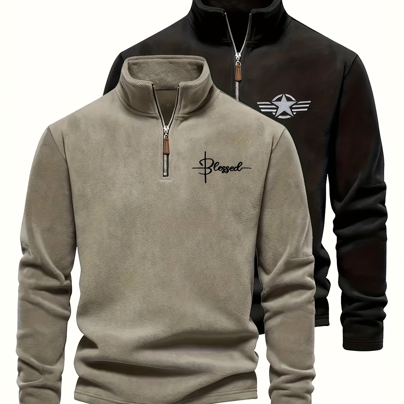 2pcs Men’s Retro Half-Zip Henley Sweaters with Embroidered Logo, Stand Collar & Metal Zippers – Light Beige & Black, Machine Washable Long Sleeve Pullovers for Autumnu002FWinter, Autumn Fashion, Vintage Style, Quality Stitching, Zipup Top, Mature Style