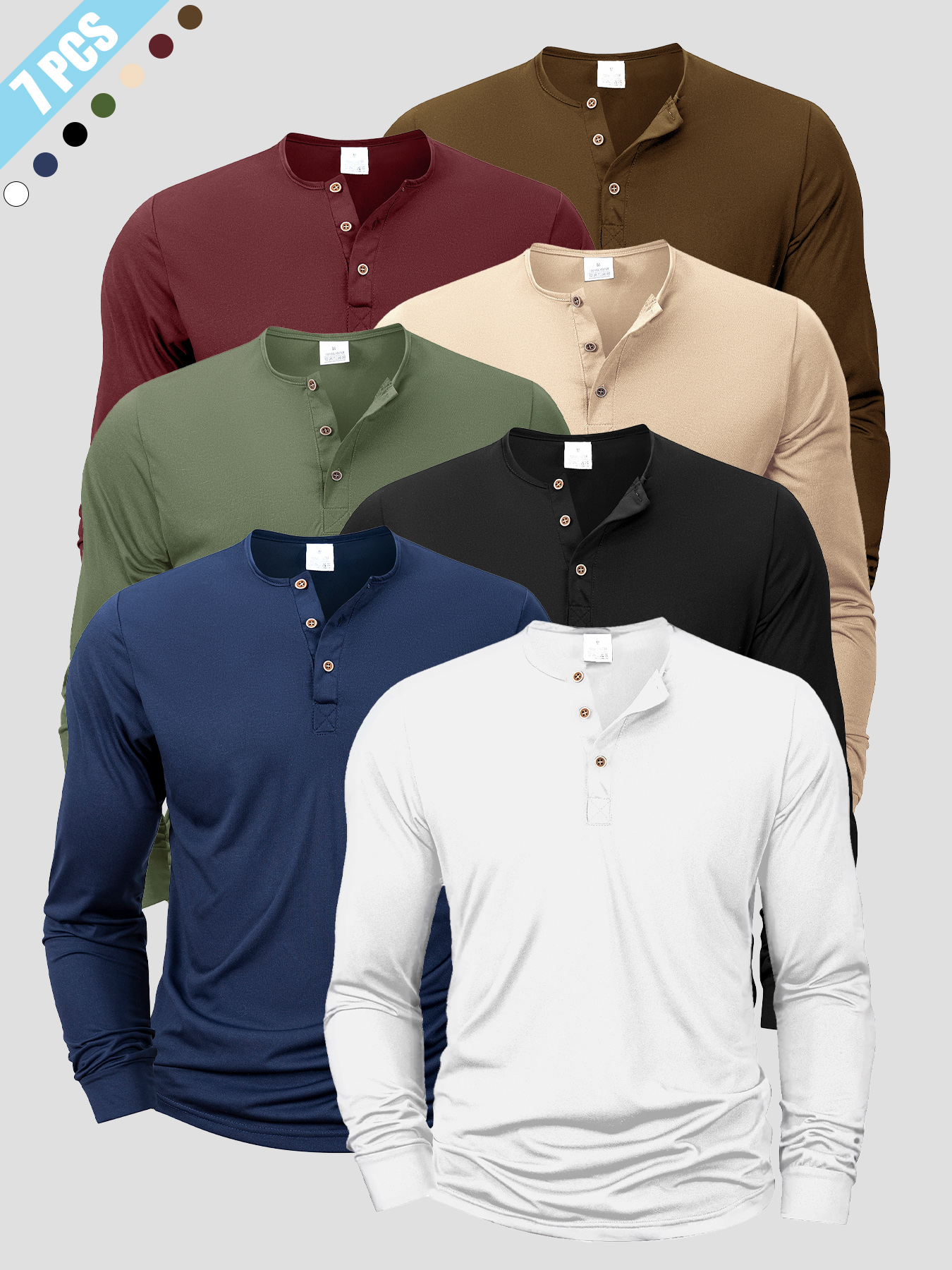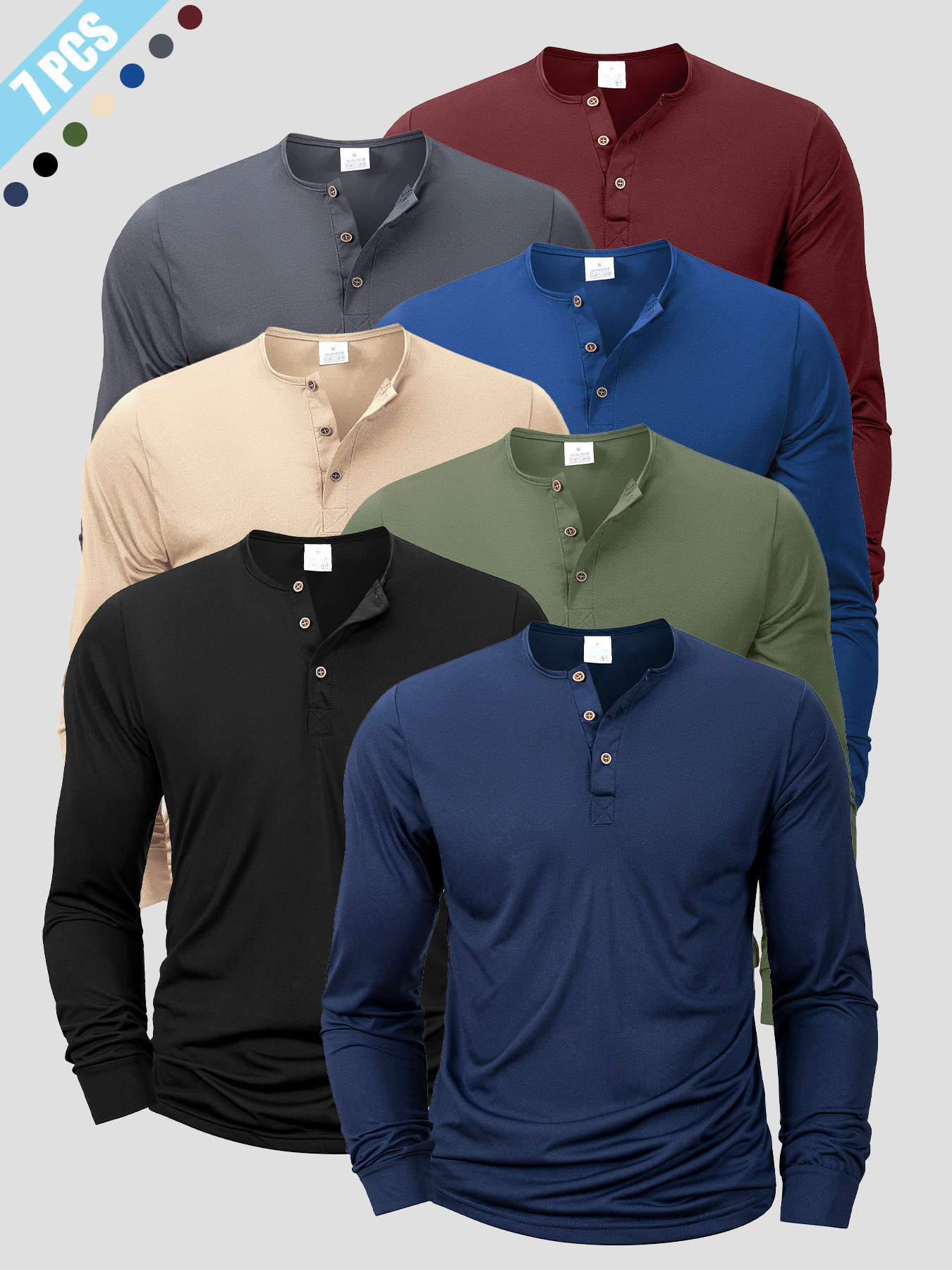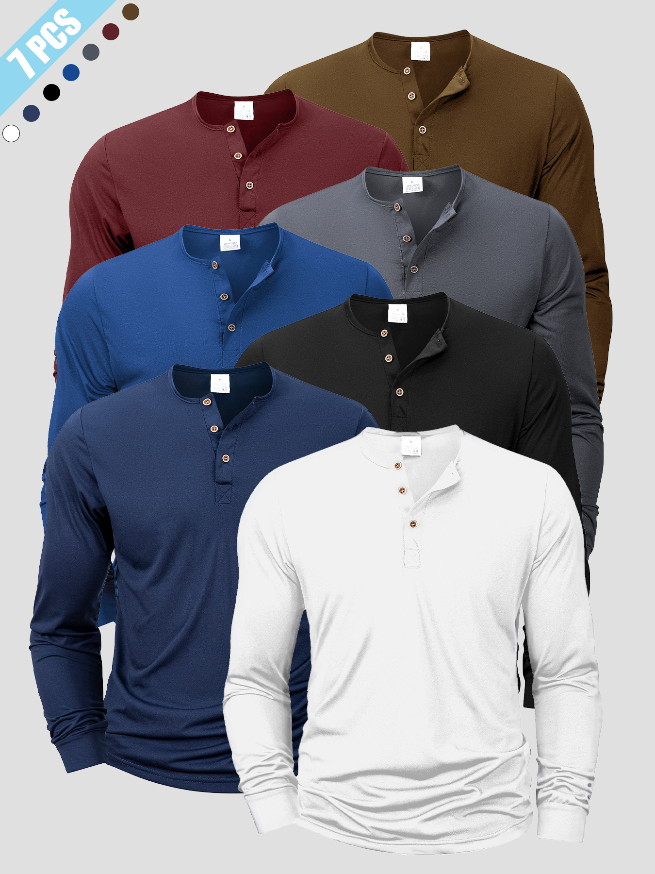 7pcs Men’s V-Neck Half-Button Placket Long Sleeve T-Shirts – Soft Casual Layering Shirts, Multi-Color Assortment (Beigeu002FBurgundyu002FNavyu002FBlacku002FWhiteu002FGreyu002FBrown) – Machine Washable Fall Winter Wardrobe Essentials for Gym, Hiking & Everyday