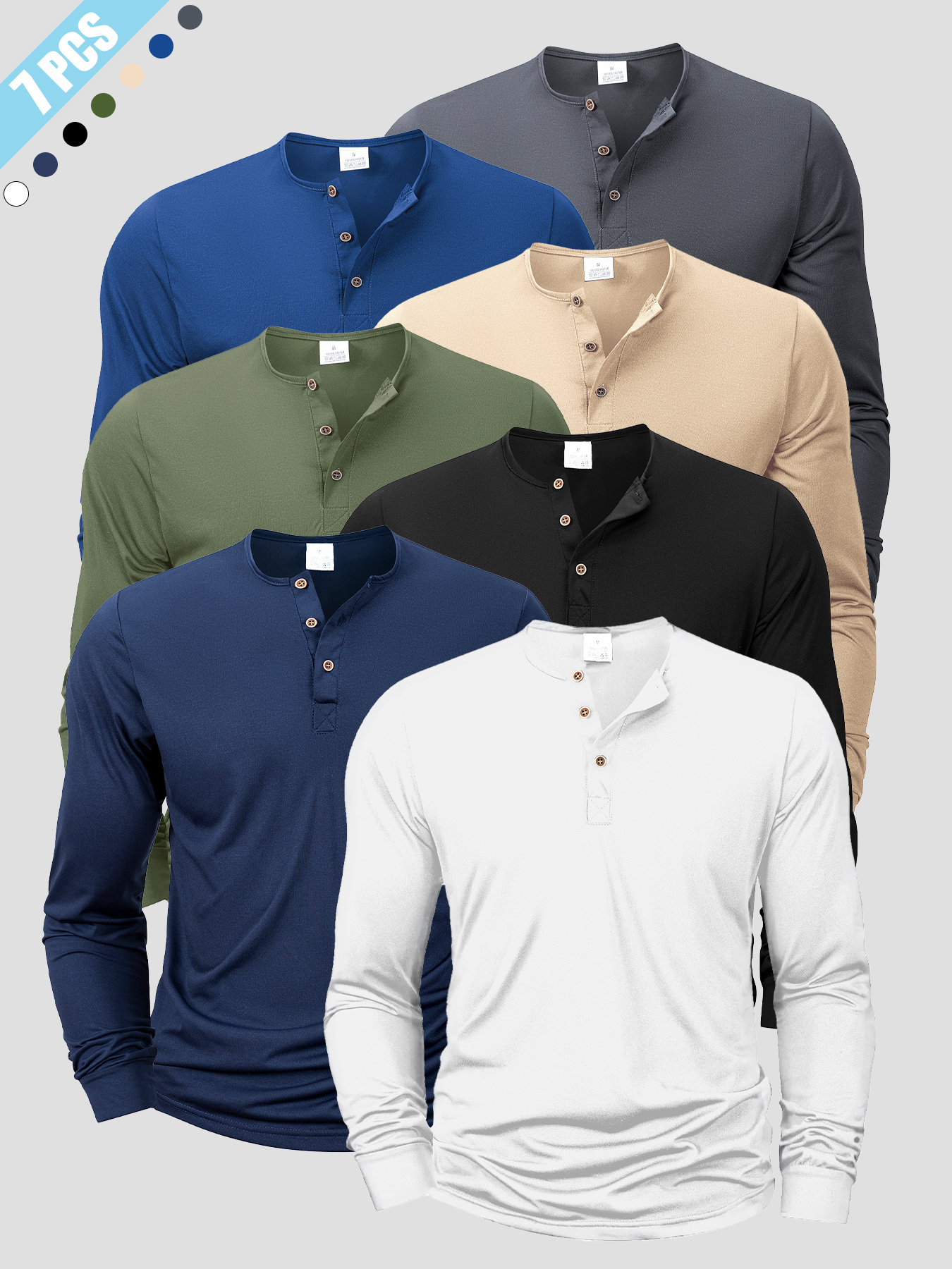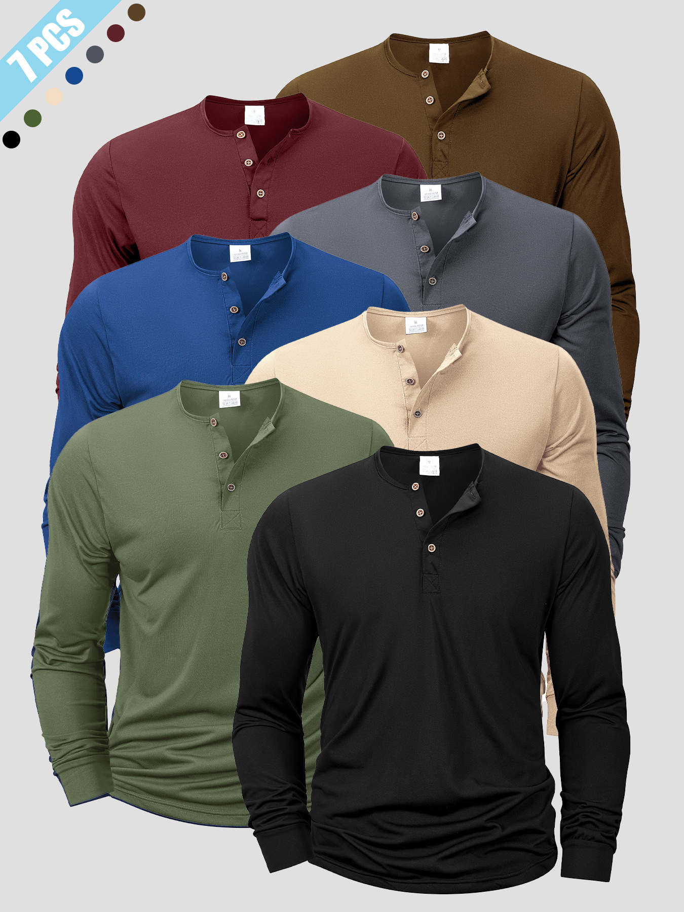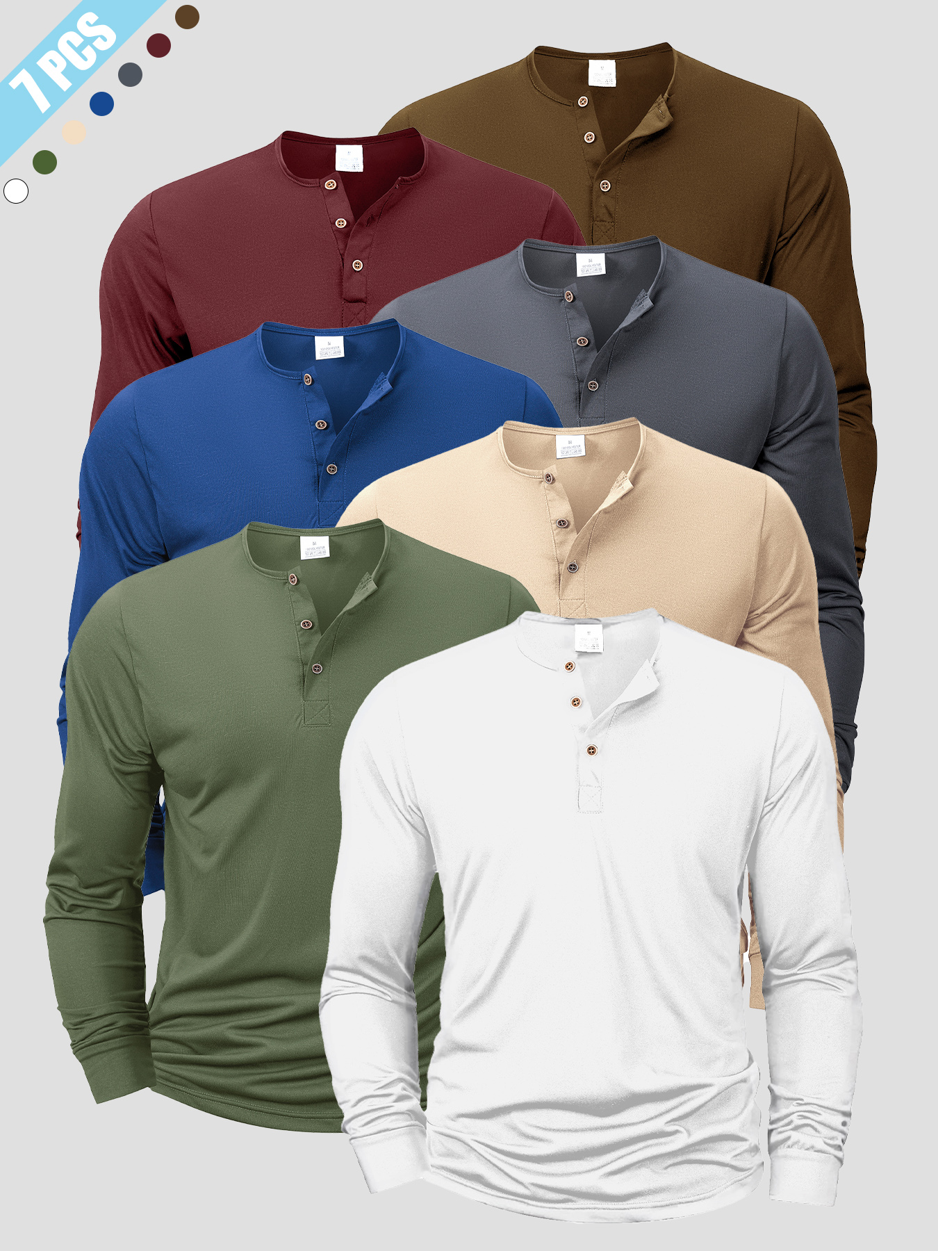 7pcs Men’s V-Neck Half-Button Placket Long Sleeve T-Shirts – Soft Casual Layering Shirts, Multi-Color Assortment (Beigeu002FBurgundyu002FNavyu002FBlacku002FWhiteu002FGreyu002FBrown) – Machine Washable Fall Winter Wardrobe Essentials for Gym, Hiking & Everyday