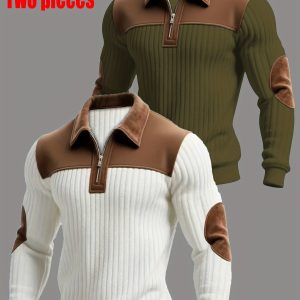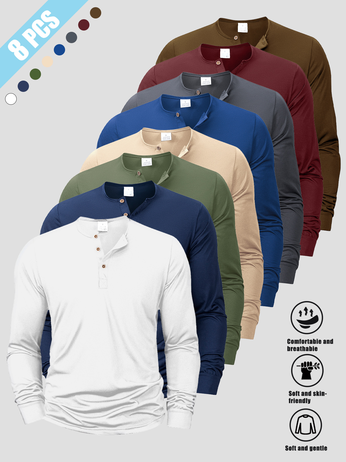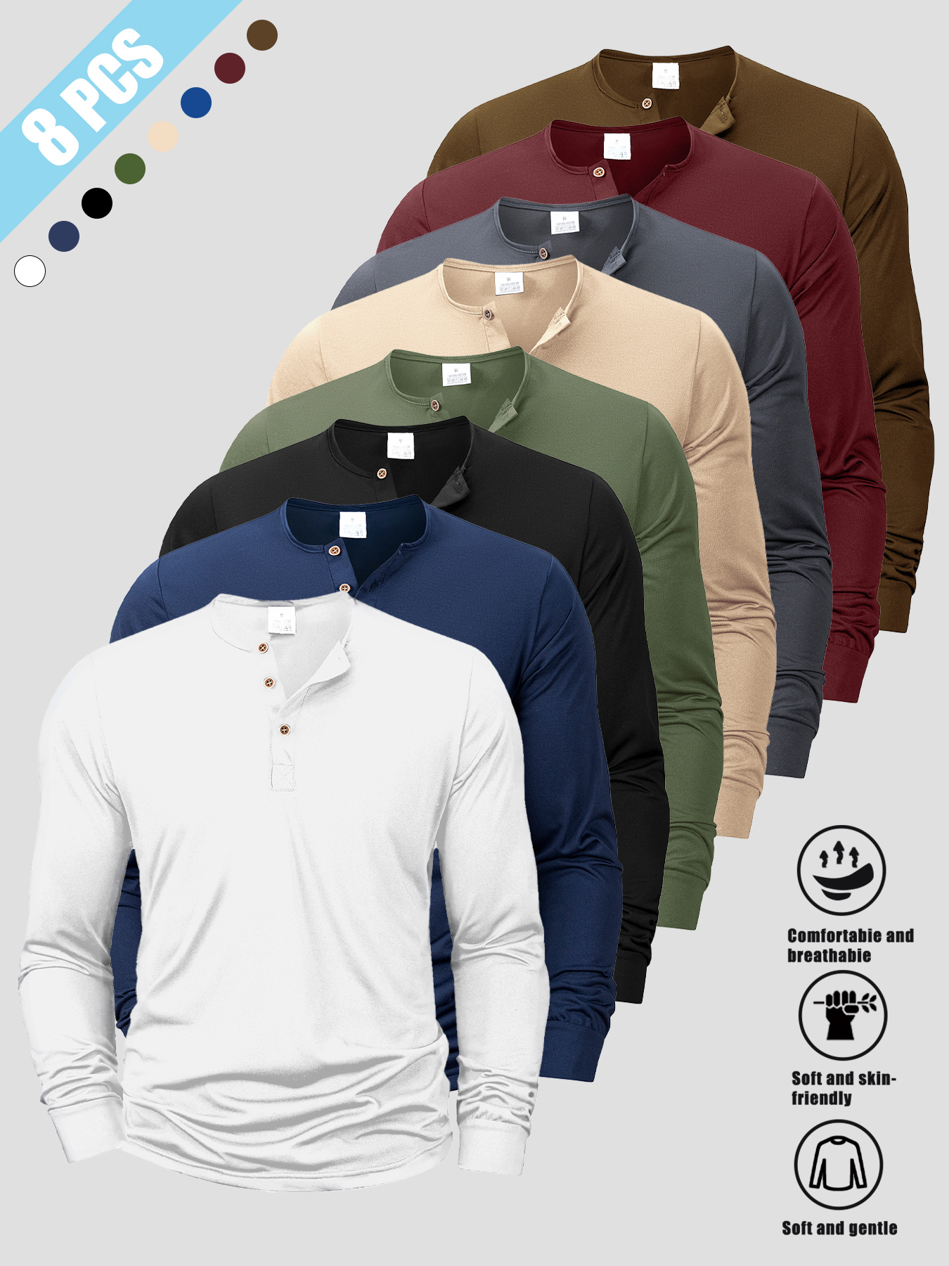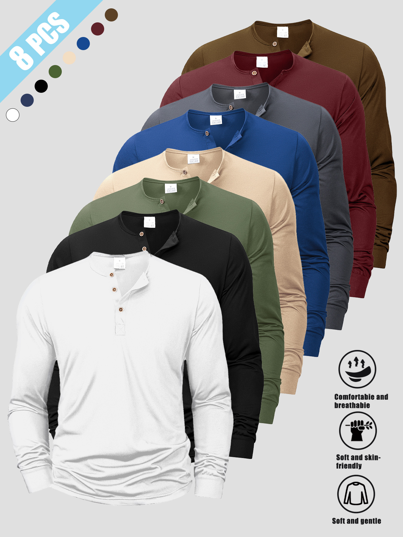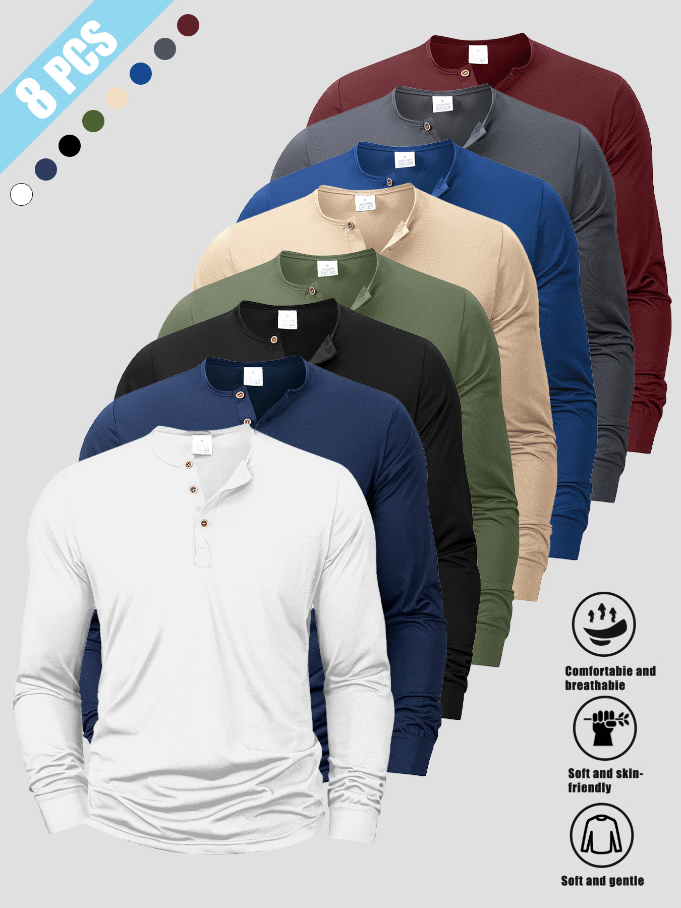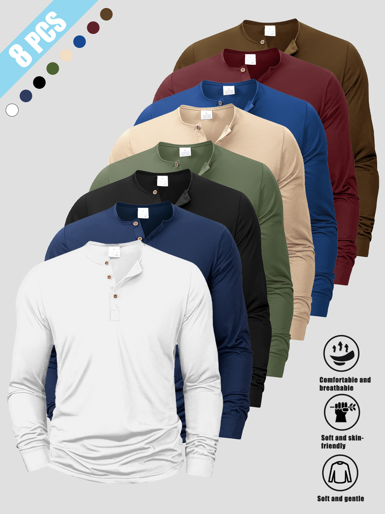 8pcs Men’s Korean-Style V-Neck Button-Front Long Sleeve Shirts – Soft Knit-like Layered Collar, Multi-Color Solid Button-Up Tops (Beigeu002FBurgundyu002FNavyu002FBlacku002FWhiteu002FGreenu002FBrownu002FTan) for Casual, Outdoor & Casual Attire – Machine Washable