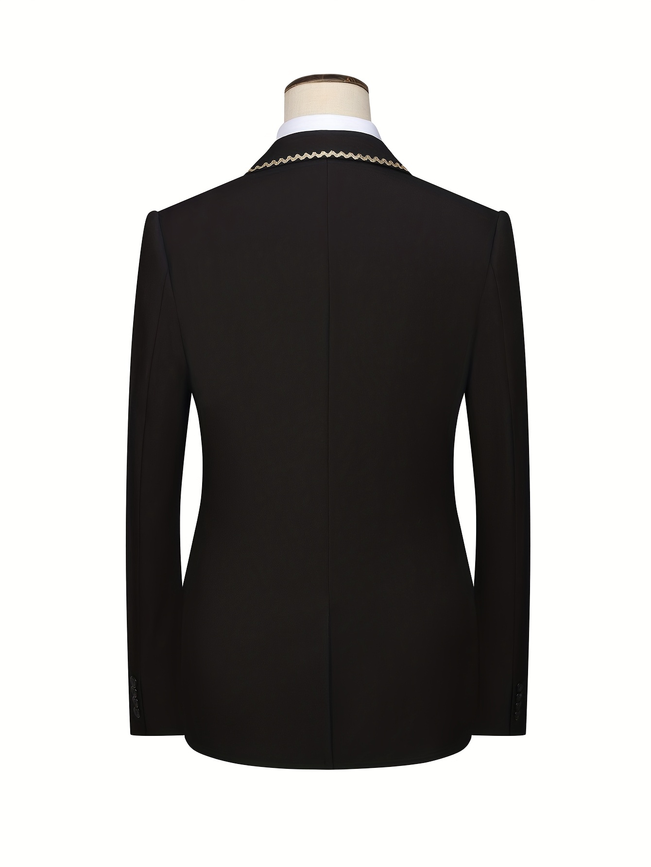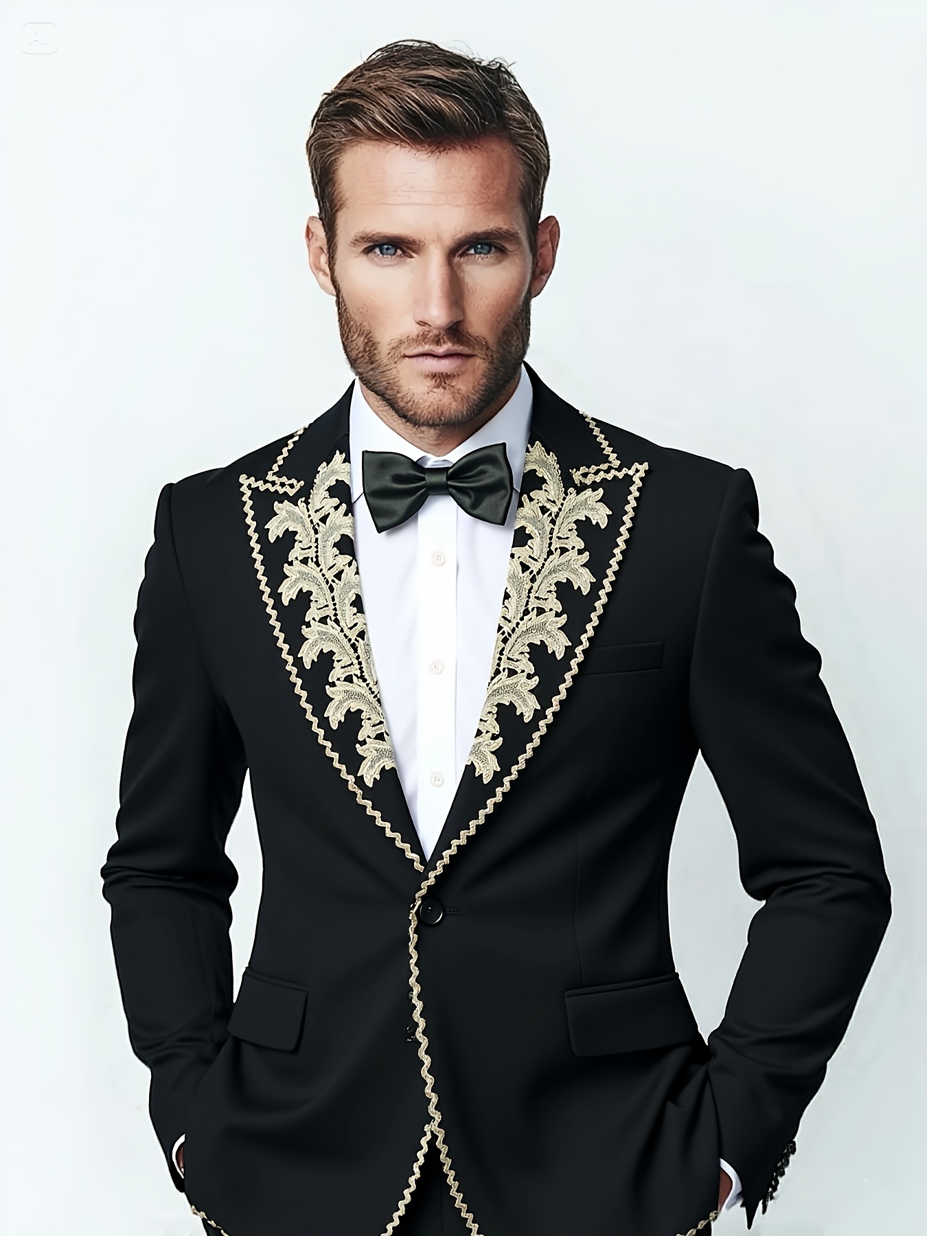 ARTUNICORN Men’s Black Tuxedo with Golden Floral Applique & Peak Lapels – Regular Fit H-Shoulder Single-Breasted Suit for Weddings, Galas & Formal Events, Wedding Attire, Classic Evening Wear, Sophisticated Tailoring
