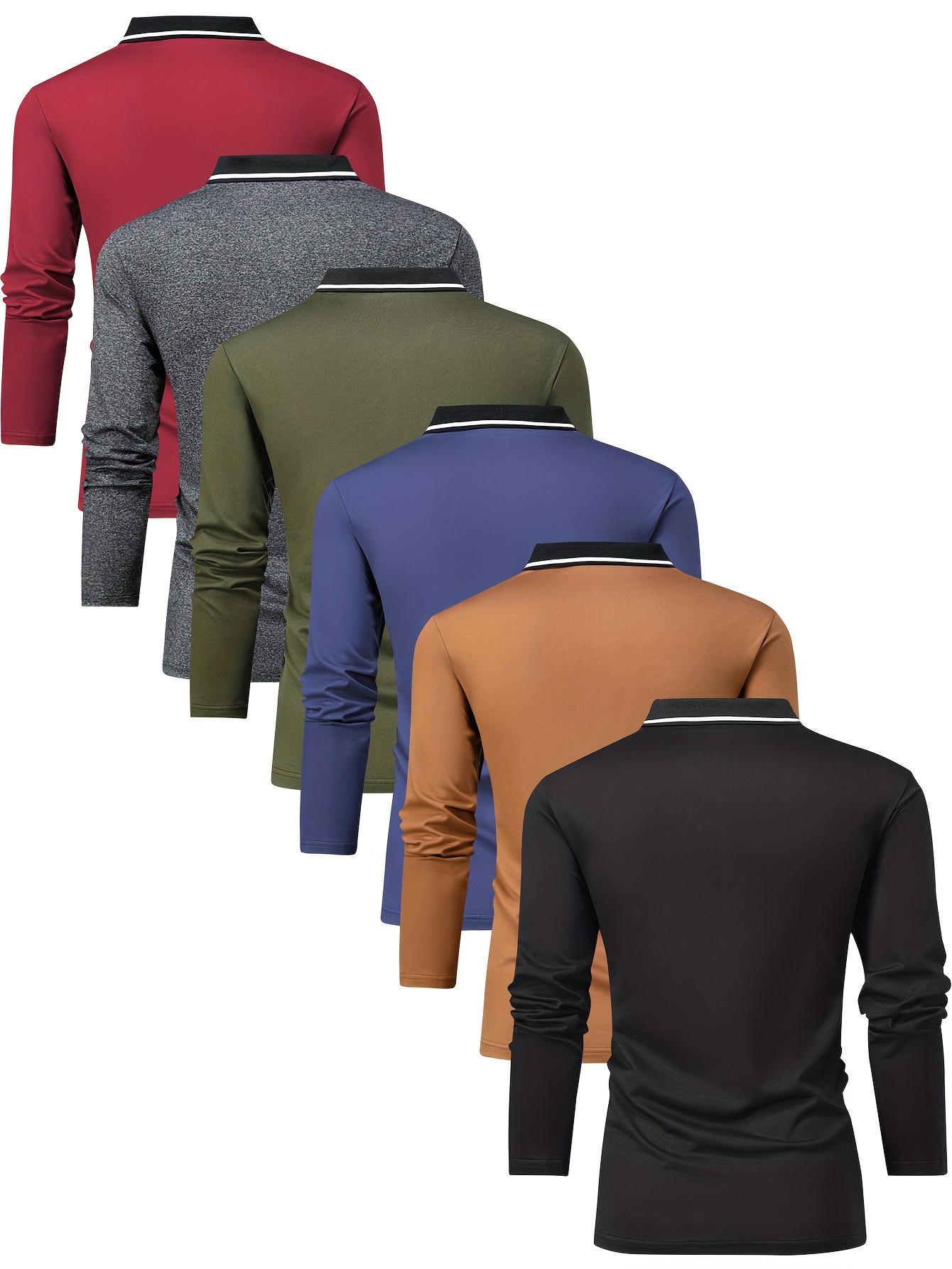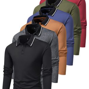 Men’S Casual Long Sleeve Button-Detail Shirts – 95% Polyester, 5% Spandex with Lapel Collar and Slight Stretch, Solid Knit Fabric for Outdoor Fitness Training, Pack of 6