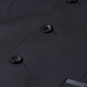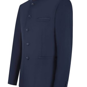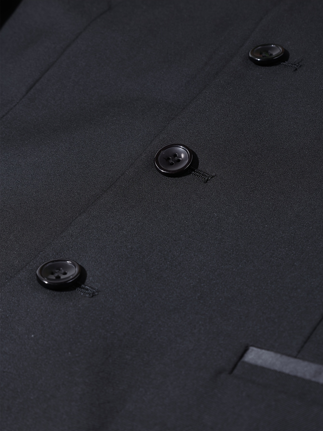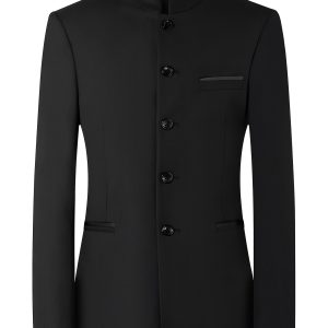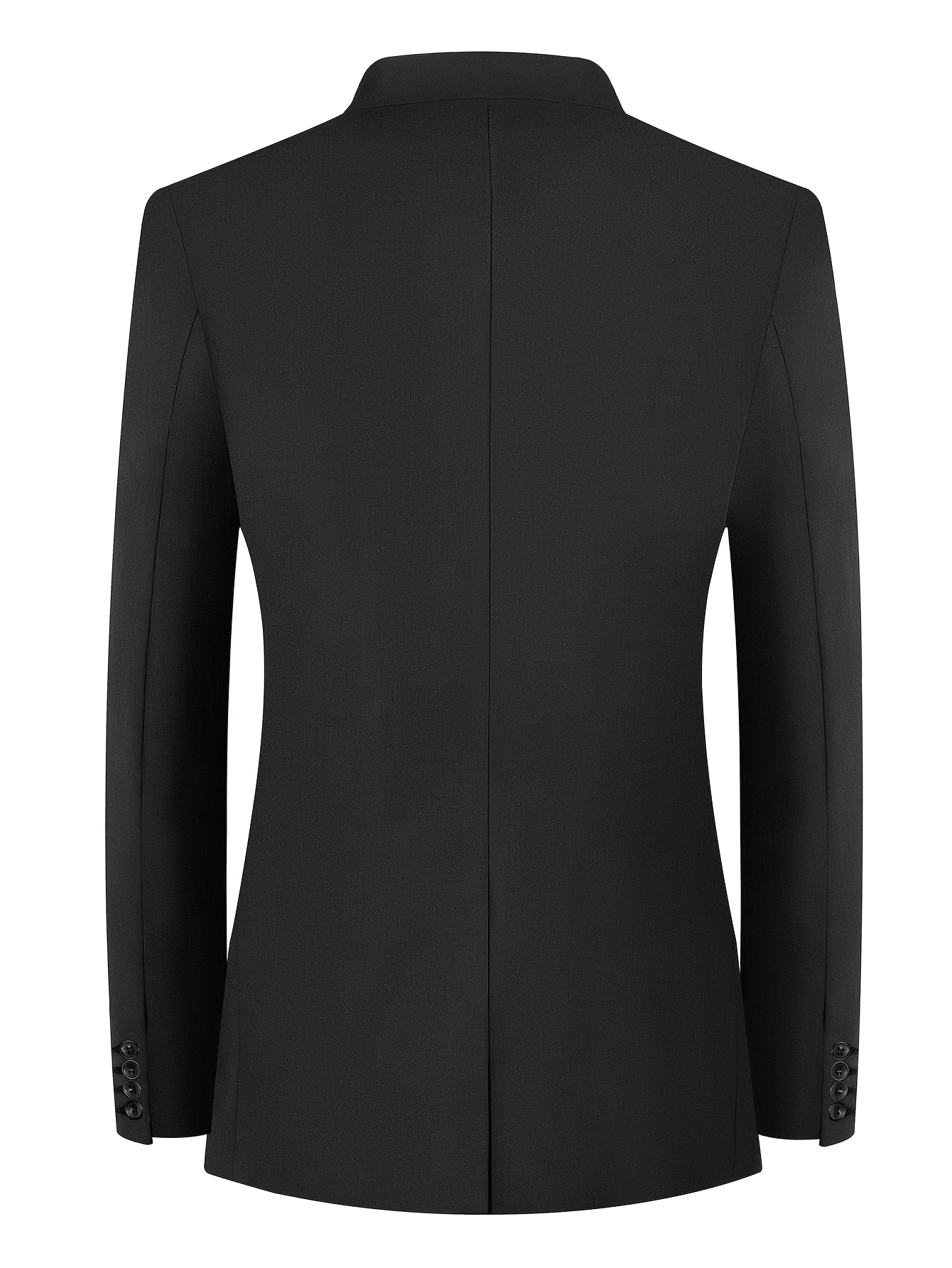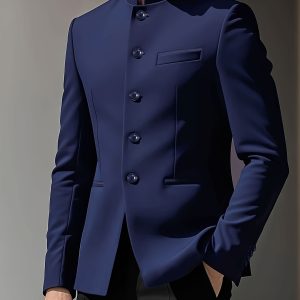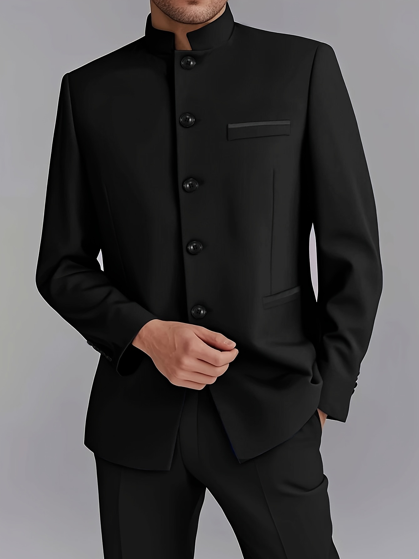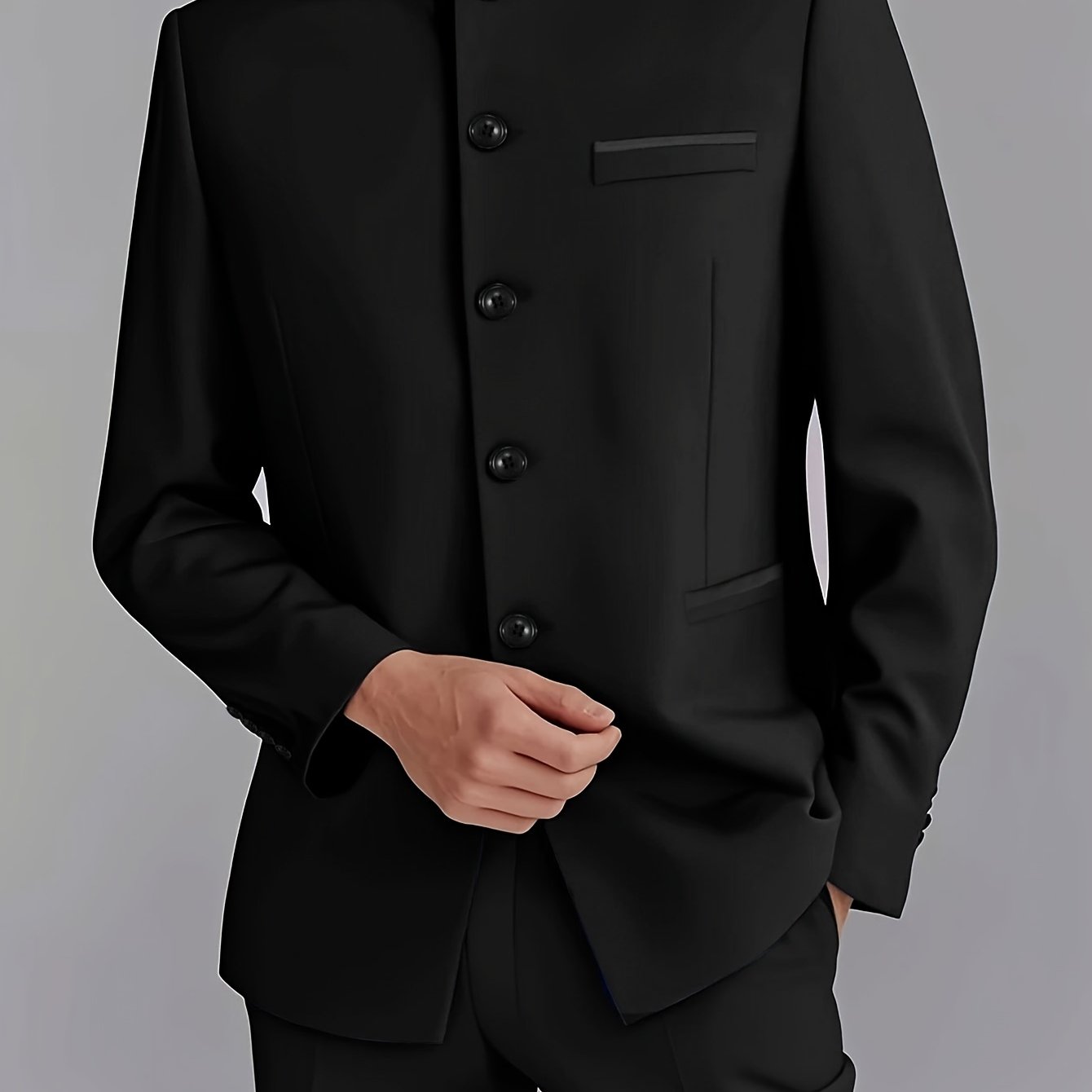 Men’S Chinese-Style Stand Collar Blazer with Black Buttons & Pockets – Solid Black Casual Business Jacket for All Seasons, Formal Attire, Classic Design, Smooth Texture