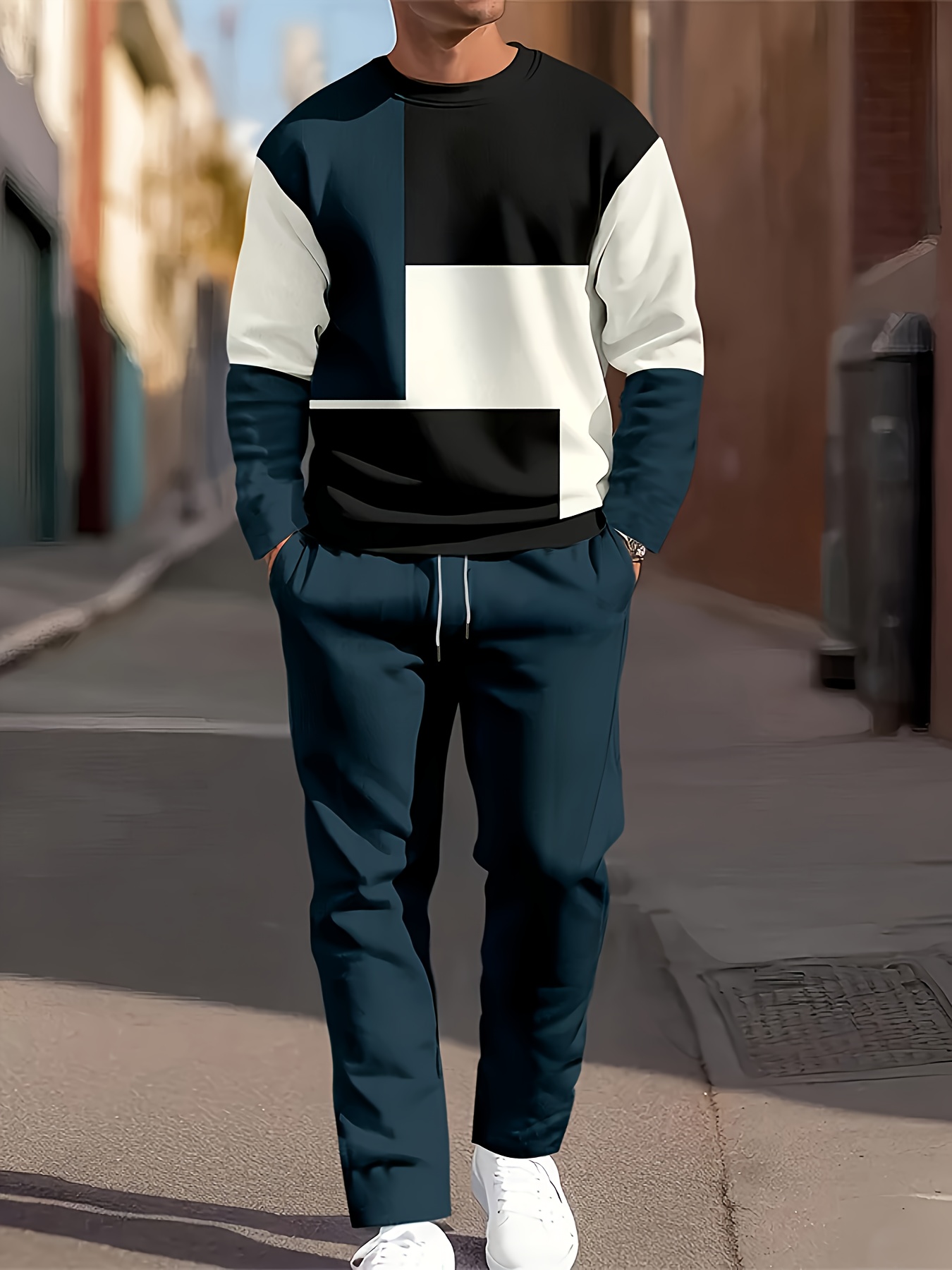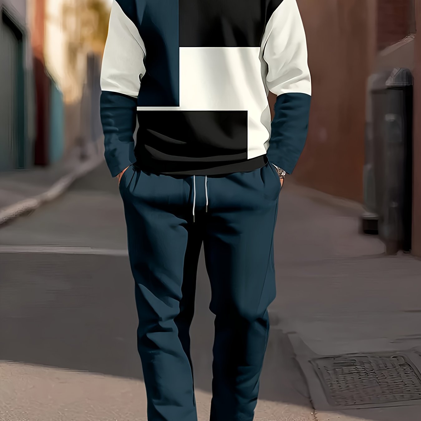 Men’s versatile multi-color color blocked geometric stripe pattern decoration Men’s long sleeved pants set for leisure vacation, Casual Attire, Leisure Outfit, Modern Style, Trendy Fashion, Durable Construction, Machine Washable, Twopiece Set, Stylish Clothing, Men’s Fashion, Young Adults