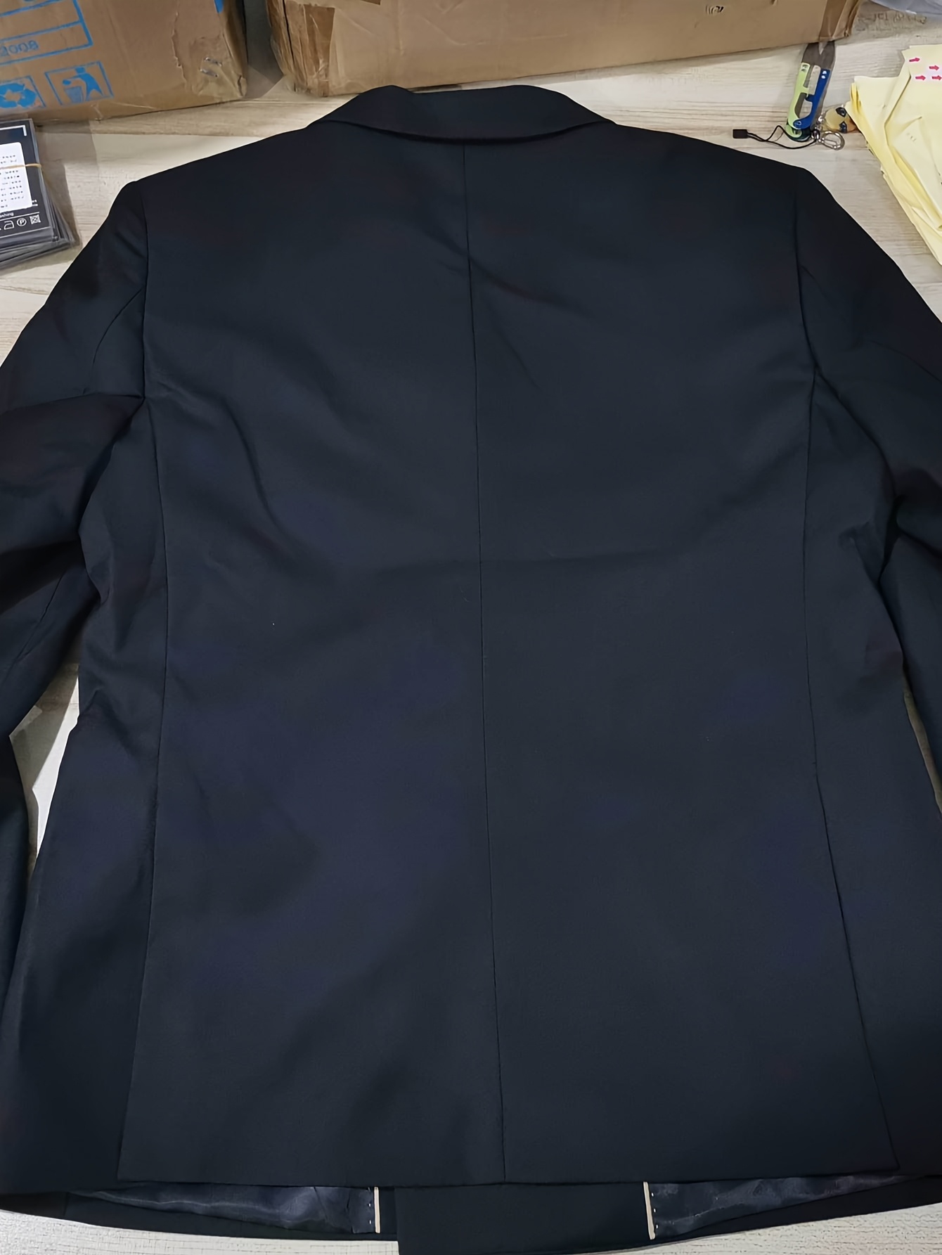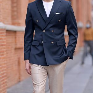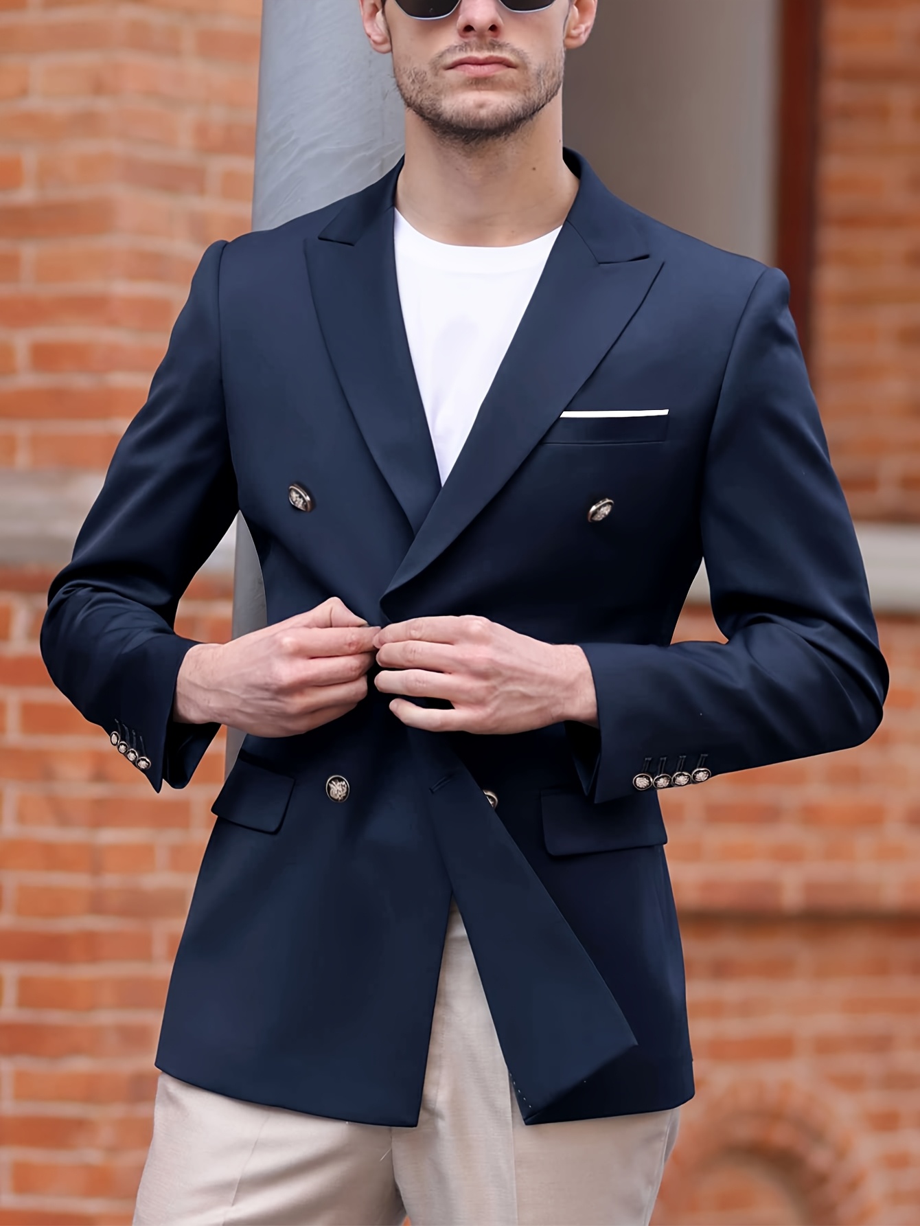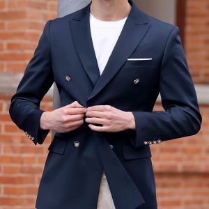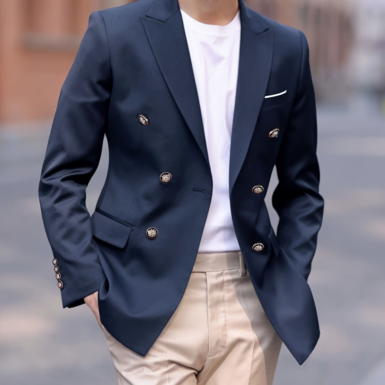 Navy Blue Men’s Double-Breasted Notch Lapel Suit Jacket – Luxury Business Casual Coat with Golden-Tone Buttons, Regular Fit All-Season Versatile Formal & Casual Wear, Solid Color Design